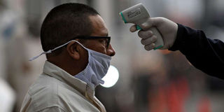 A transit police officer checks the temperature of a truck driver as a preventive measure against the new coronavirus, during a partial curfew ordered by the government in Villa Nueva, Guatemala, on April 2, 2020. PHOTO | JOHAN ORDONEZ |AFP