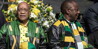 In this file photo taken on July 31, 2016, South African ruling party African National Congress (ANC) president Jacob Zuma (left) and deputy Cyril Ramaphosa arrive for the ANC closing rally campaign for the municipal elections at Ellis Park Stadium in Johannesburg. PHOTO | GIANLUIGI GUERCIA | AFP FILE PHOTO | AFP