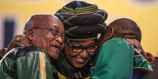 In this file photo taken on Dec 16, 2017 Winnie Mandela (centre), hugs South African President Jacob Zuma (left) and Deputy President Cyril Ramaphosa as they attend the 54th ANC National Conference in Johannesburg. FILE PHOTO | AFP