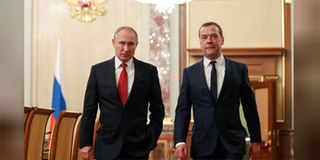 Russian President Vladimir Putin and Prime Minister Dmitry Medvedev speak before a meeting with members of the government in Moscow, Russia January 15, 2020. PHOTO | REUTERS