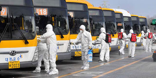 South Korean government officials wearing protective gear spray disinfectant as part of preventive measures against the spread of the Covid-19 at a bus garage in Gwangju on March 3, 2020. PHOTO | YONHAP | AFP